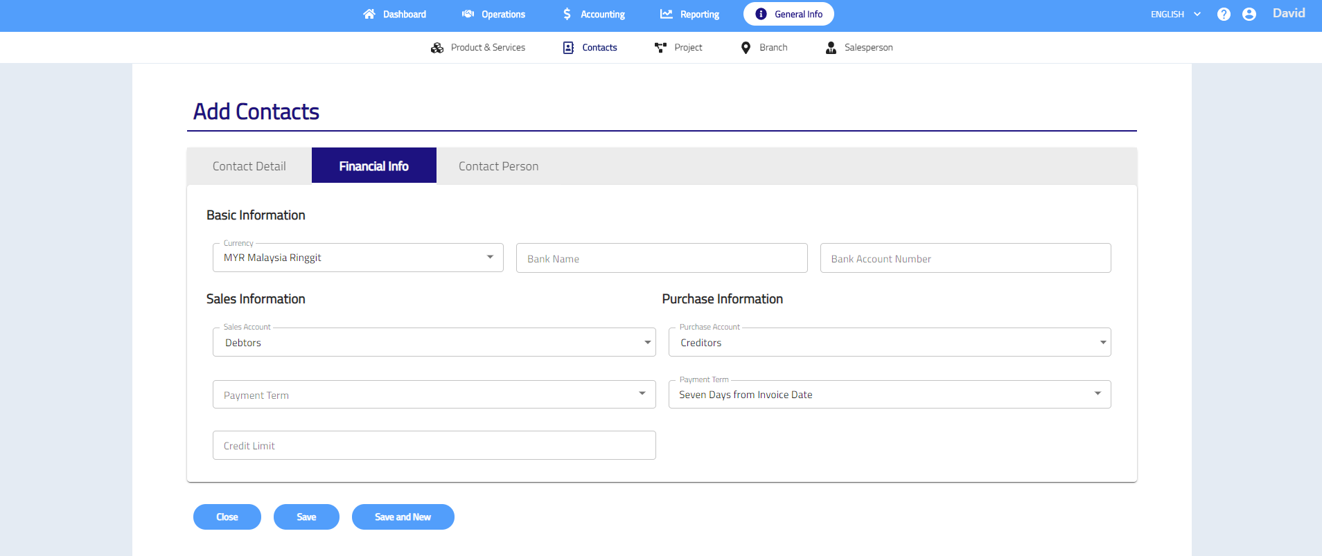 Financial Info – Record customers or suppliers’ financial info such as bank name, bank account number and payment term.