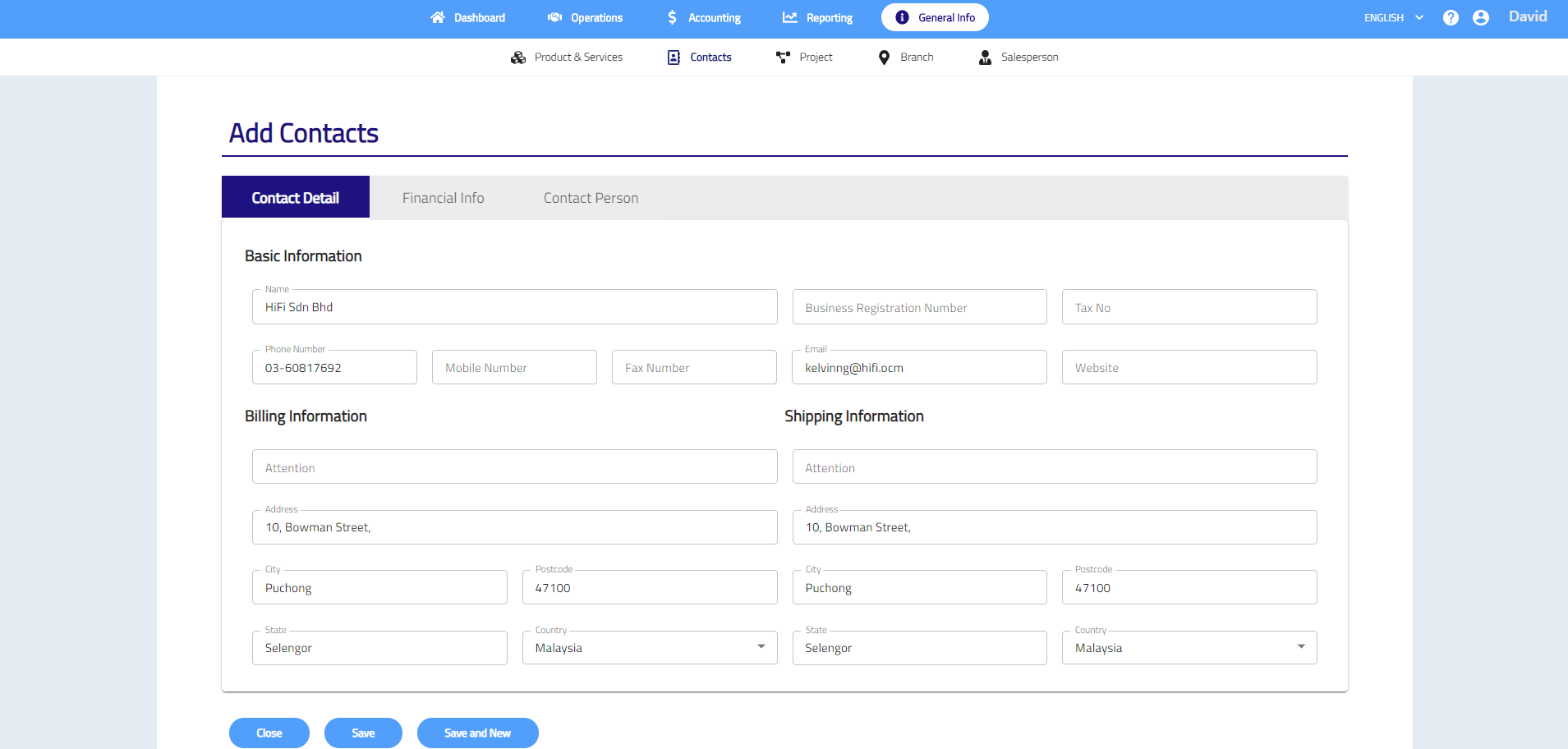 - Click Save to save new contacts or click Save and New to continue adding new contacts.