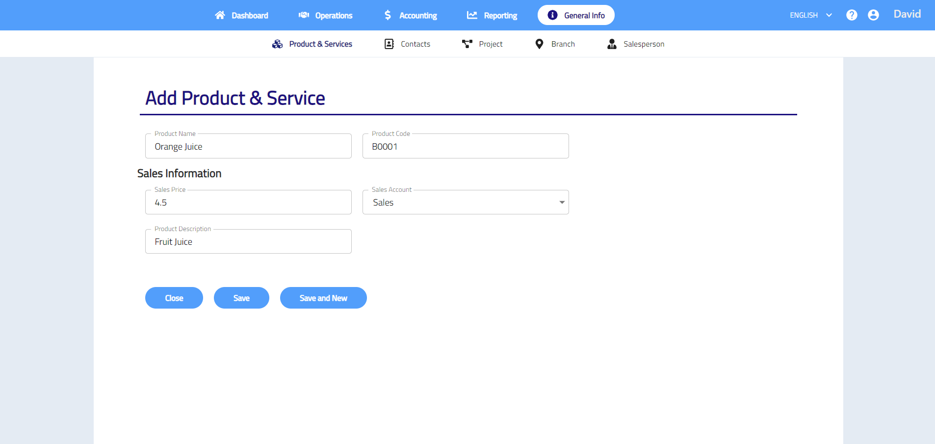 - Click Save to save new product & service or click Save and New to continue adding new product and services.