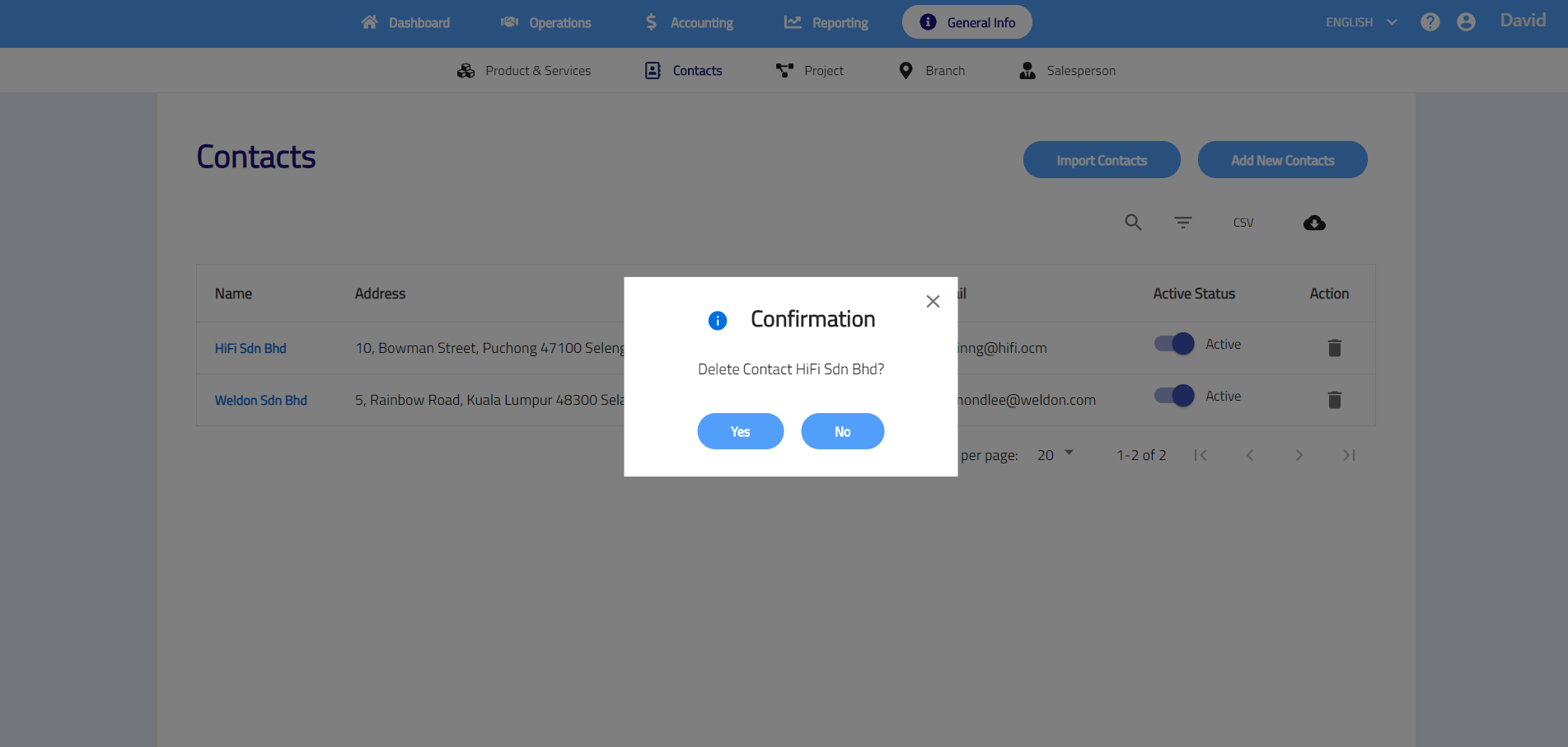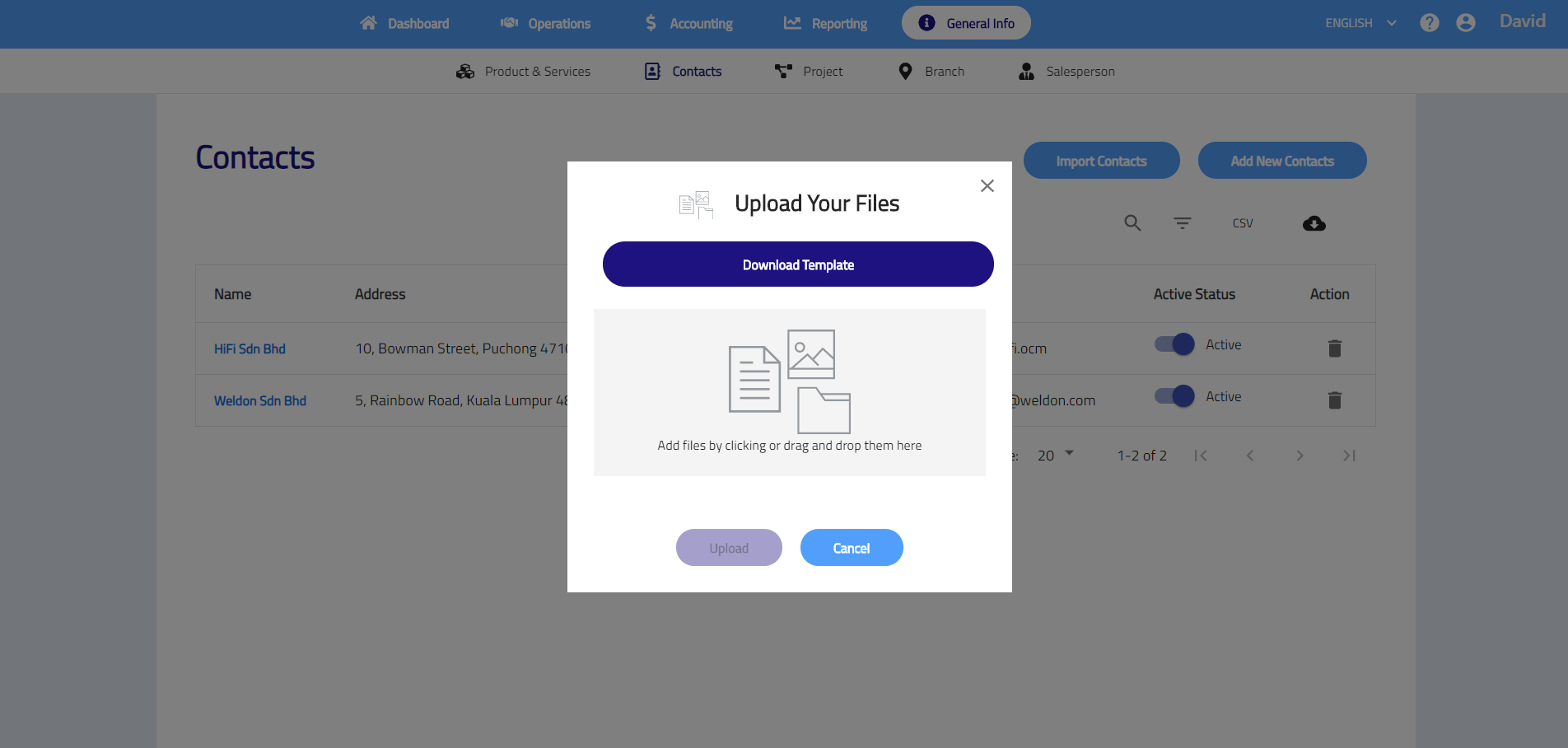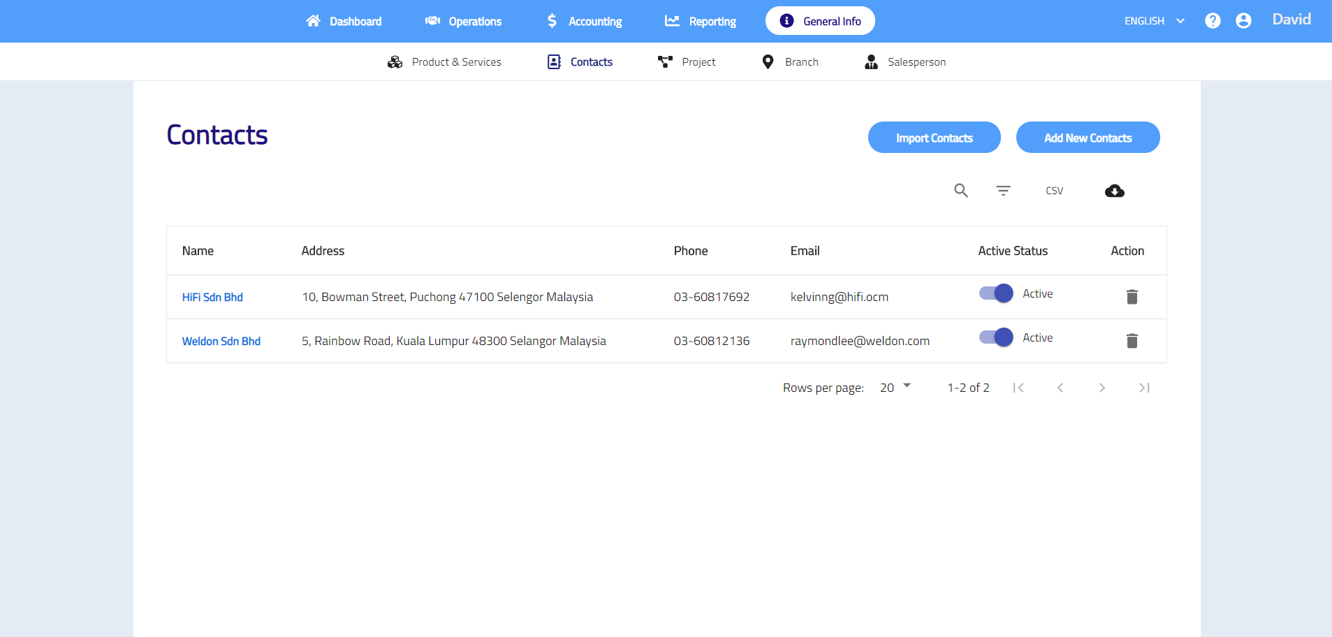 Contacts shows list of customer and/or supplier contacts that your business has. You may import and manage the contacts in the contacts list. All contacts can be used when creating customer, supplier and cash transactions.