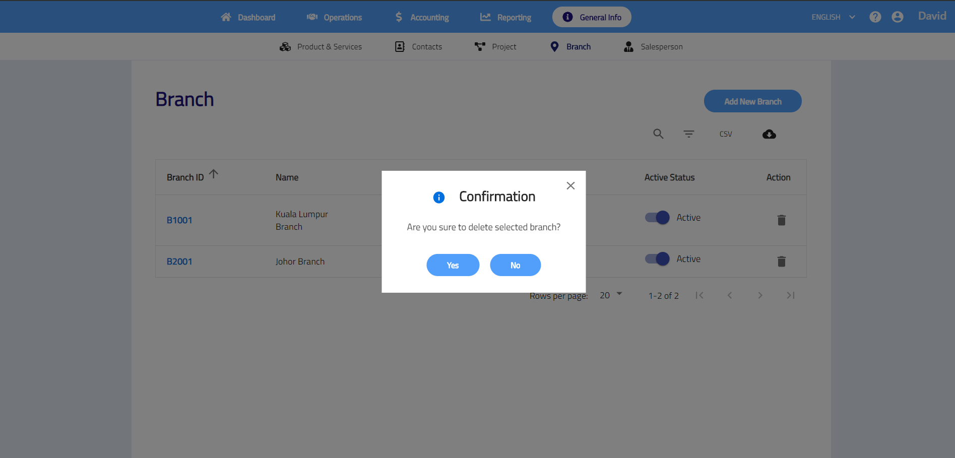 Branch shows list of branch that you have. You may add and manage the branch here. All branches will be used when creating any transactions.