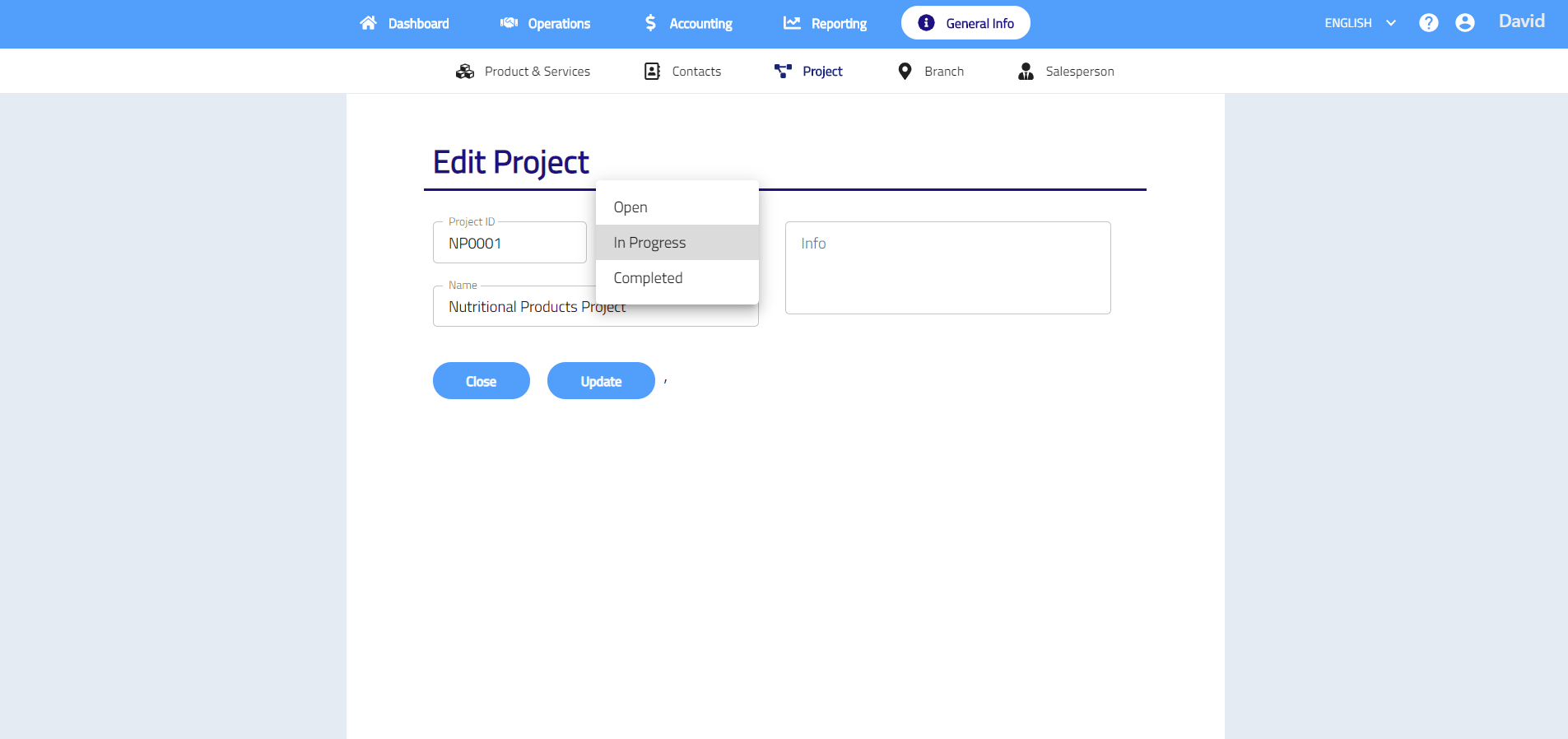 - Enter project ID and name, select status and enter info if neccesary.