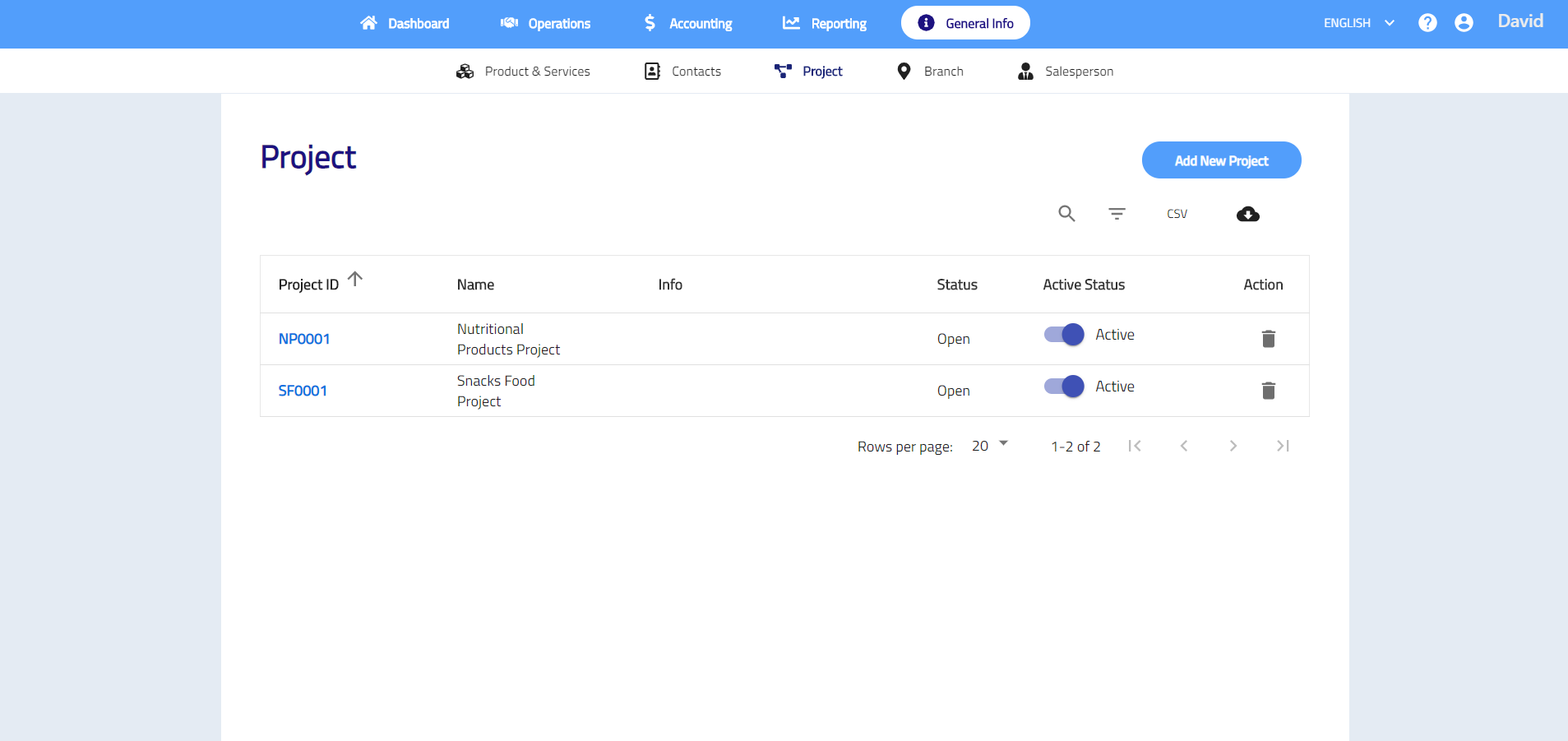 to download project list in csv file or click